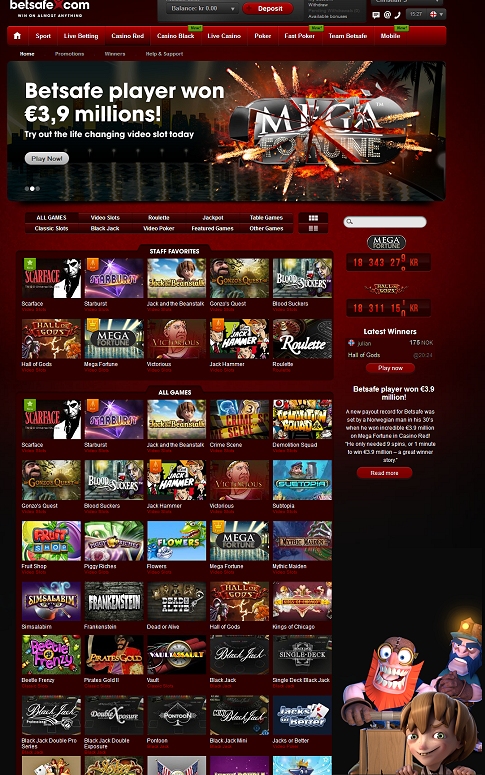 Betsafe Video Slots: As We Covered Above There Are Several Different Softwares In Play Here In Casino Red And Casino Black. The Most Popular Video Slot Is The Mega Fortune 5 Reel Slot With An Enormous Jackpot Plus 2 Smaller Ones Of Decent Sizes. Mega Fortune Also Have Free Spins With Muiltiplying Payouts And Wild Symbols. Regular Symbols Can Pay Out A Nice Amount Too And The Graphics Are Nice. No Wonder This Is One Of The Most Played Video Slots On The Net. There Are Of Course Also Tons Of Other High Quality Slots With Jackpots Like Mega Fortune. Due To The Huge Selection Of Quality Slots In Both Casino Red And Casino Black Betsafe Is Our Favourite And Highest Recommended Online Casino. Other Popular Slot Titles Are Jack And The Beanstalk, Hall Of Gods, Geisha Wonders, Mega Joker, Street Fighter 2, Call Of Duty 4 And Mega Moolah. You Can Visit Betsafe Casino And Check Out All Their Games Without Having To Register. Most Of Them Also Offers Demo Play